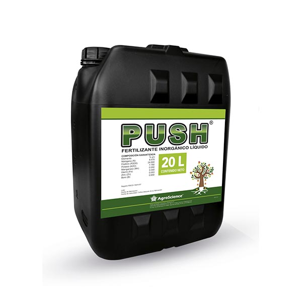 PUSH es un fertilizante con un pH ligeramente ácido, su fórmula balanceada mejora las condiciones del suelo, así como incrementa el desarrollo de la microflora bacteriana. Se puede aplicar al suelo y vía foliar. Por su composición química equilibrada, evita la formación de compuestos insolubles, mismos que ocasionan taponamientos en los sistemas de fertirrigación.