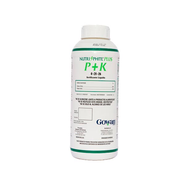 Es un fertilizante agrícola en forma líquida que se puede aplicar al suelo y follaje, para estimular los mecanismos de defensa de la planta, la formulación tiene un balance entre el fósforo y el potasio que aporta importantes beneficios agronómicos a la planta, como estimulación floral, amarre de fruto, entre otras; esta tecnología que evita que la molécula de Fosfito se oxide por la que su acción es más contundente y duradera. NUTRIPHITE PLUS P+K posee 28% de Fósforo, 26% de Potasio es sistémico y una herramienta para la protección de cultivos de Hortalizas, Vegetales, Leguminosas, Berries, Bulbos o Tubérculos, Frutales perennes y Frutales caducifolios.
